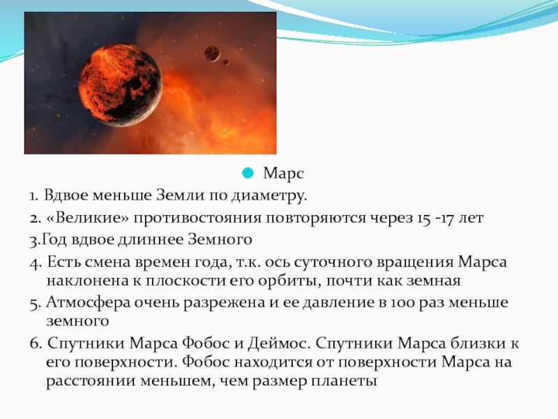 Марс1. Вдвое меньше Земли по диаметру.2. «Великие» противостояния повторяются через 15 -17 лет3.Год вдвое длиннее Земного4. Есть