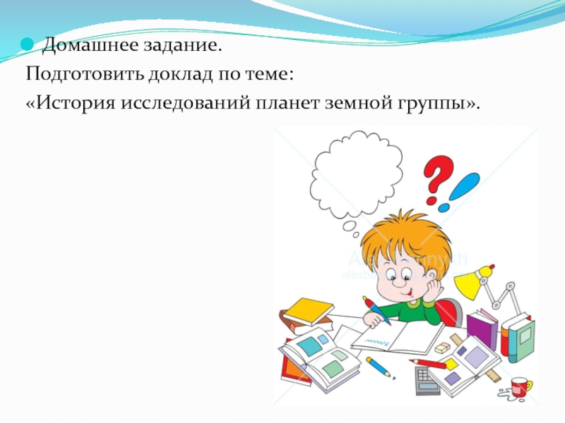 Домашнее задание.Подготовить доклад по теме:«История исследований планет земной группы».