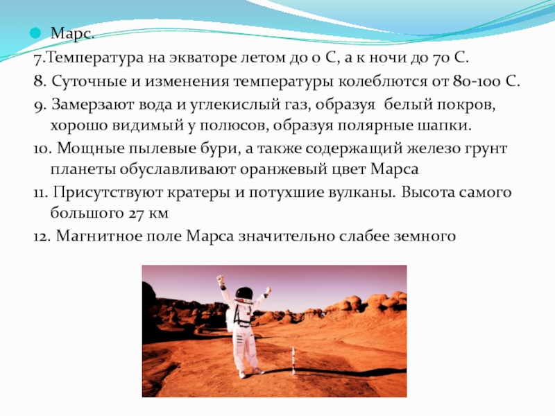 Марс.7.Температура на экваторе летом до 0 С, а к ночи до 70 С. 8. Суточные и изменения