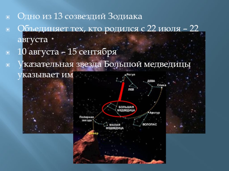 Одно из 13 созвездий ЗодиакаОбъединяет тех, кто родился с 22 июля – 22 августа10 августа – 15 сентябряУказательная звезда Большой медведицы указывает именно на Льва