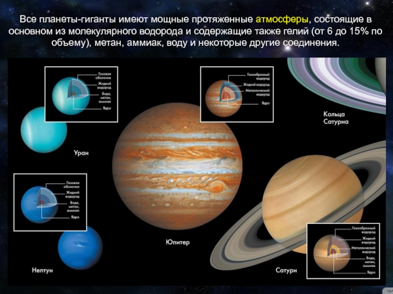 Слайд 4Все планеты-гиганты имеют мощные протяженные атмосферы, состоящие в основном из молекулярного