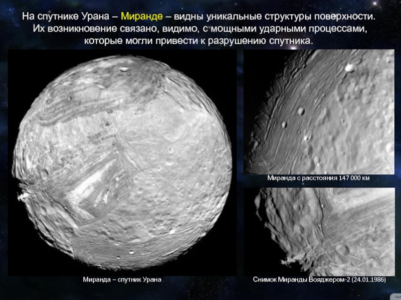 Слайд 18На спутнике Урана – Миранде – видны уникальные структуры поверхности.