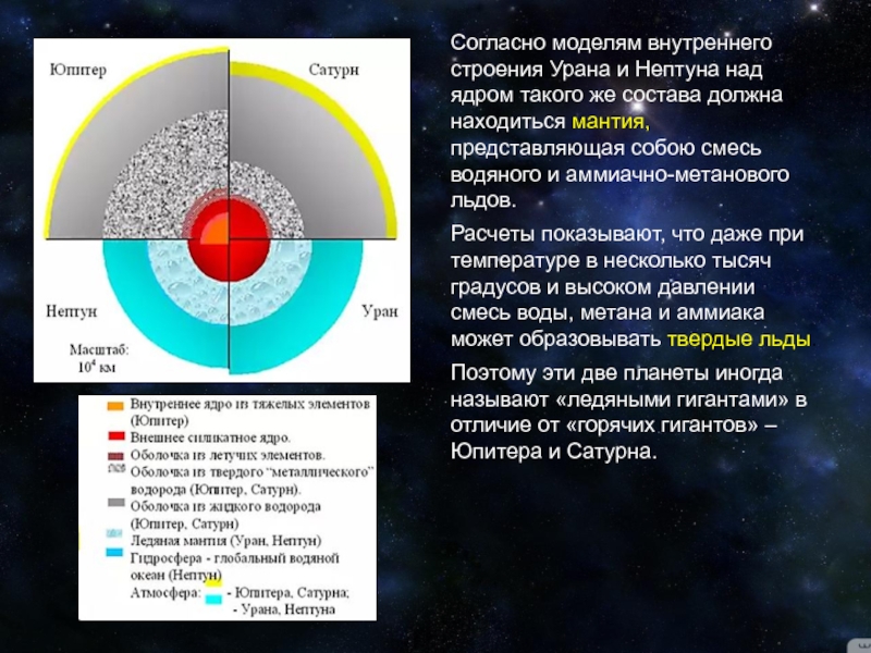 Слайд 11Согласно моделям внутреннего строения Урана и Нептуна над ядром такого же