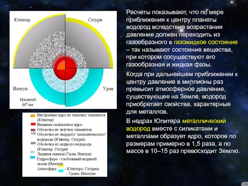 Слайд 10Расчеты показывают, что по мере приближения к центру планеты водород вследствие