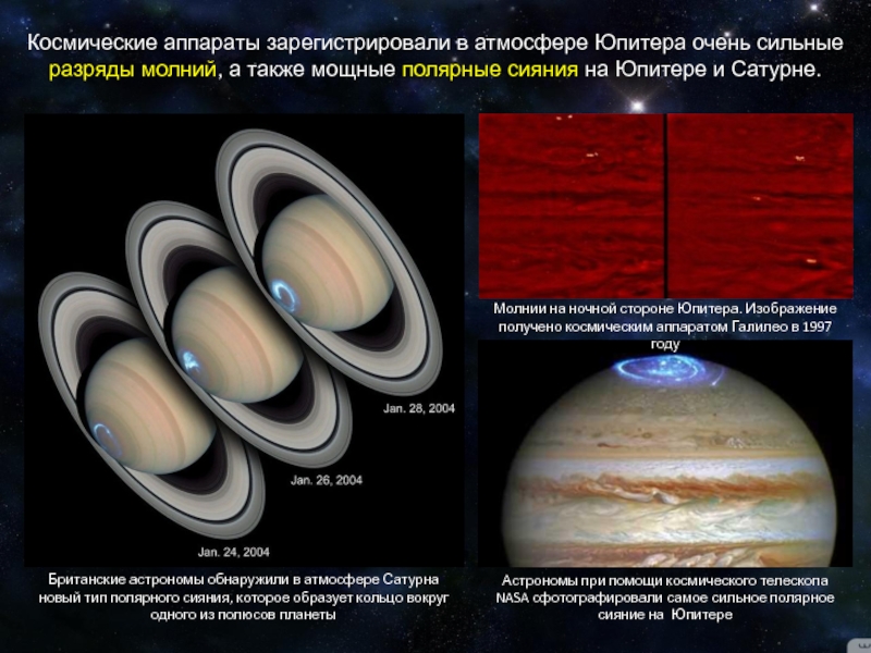 Слайд 13Космические аппараты зарегистрировали в атмосфере Юпитера очень сильные разряды молний, а