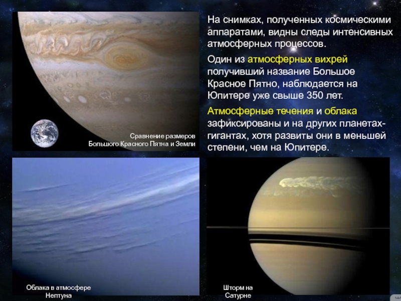 Слайд 7На снимках, полученных космическими аппаратами, видны следы интенсивных атмосферных процессов.