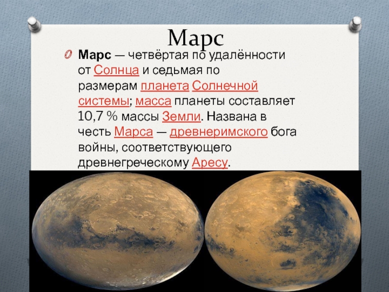 МарсМарс — четвёртая по удалённости от Солнца и седьмая по размерам планета Солнечной системы; масса планеты составляет 10,7 % массы Земли. Названа в честь Марса — древнеримского бога войны, соответствующего древнегреческому Аресу.