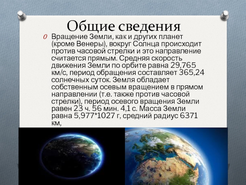 происходит против часовой стрелки и это направление считается прямым. Средняя скорость движения Земли по орбите равна 29,765 км/с, период обращения составляет 365,24 солнечных суток. Земля обладает собственным осевым вращением в прямом направлении (т.е. также против часовой стрелки), период осевого вращения Земли равен 23 ч. 56 мин. 4,1 с. Масса Земли равна 5,977*1027 г, средний радиус 6371 км,