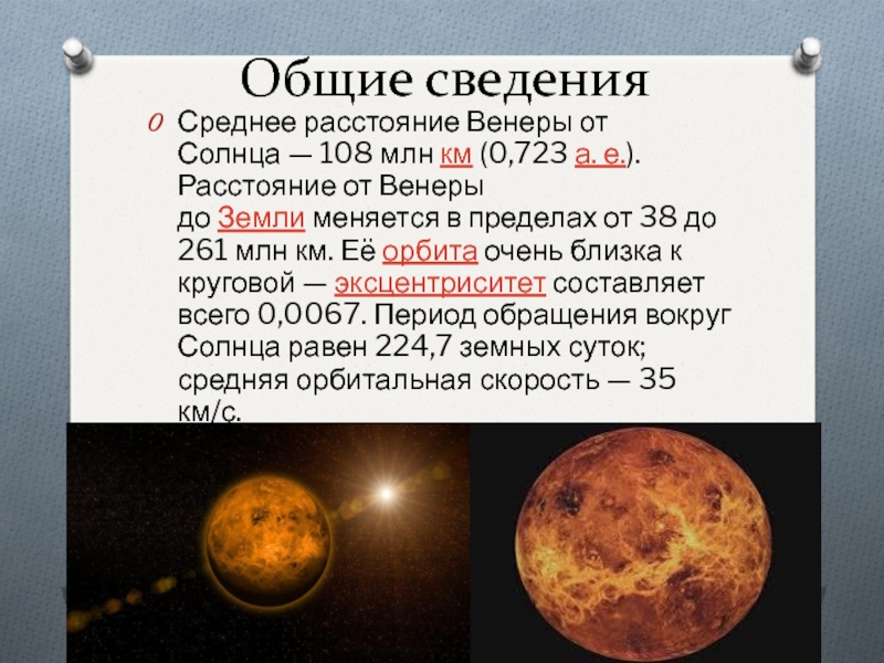 Общие сведенияСреднее расстояние Венеры от Солнца — 108 млн км (0,723 а. е.). Расстояние от Венеры до Земли меняется в пределах от 38 до