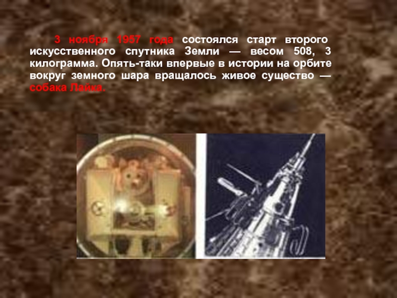 весом 508, 3 килограмма. Опять-таки впервые в истории на орбите вокруг земного шара вращалось живое существо — собака Лайка.