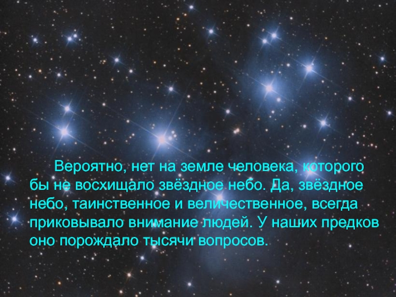 Слайд 2 Вероятно, нет на земле человека, которого бы не восхищало звёздное небо.