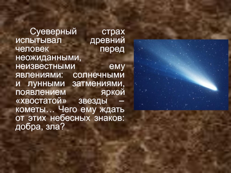 Слайд 3 Суеверный страх испытывал древний человек перед неожиданными, неизвестными ему явлениями: солнечными