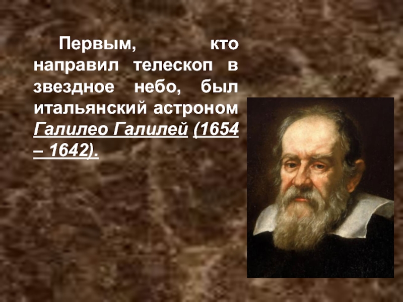 Слайд 32 Первым, кто направил телескоп в звездное небо, был итальянский астроном Галилео
