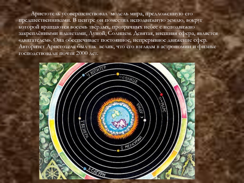 Слайд 13 Аристотель усовершенствовал модель мира, предложенную его предшественниками. В центре он поместил