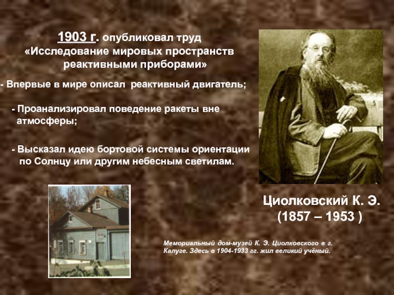 Мемориальный дом-музей К. Э. Циолковского в г.Калуге. Здесь в 1904-1933 гг. жил великий учёный.