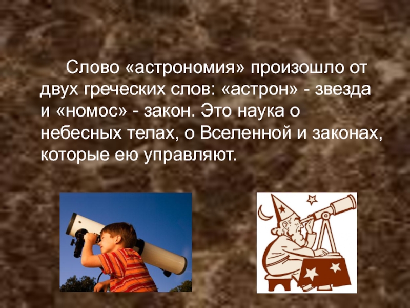 «номос» - закон. Это наука о небесных телах, о Вселенной и законах, которые ею управляют.