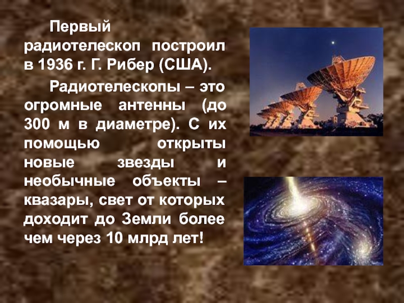 Слайд 36 Первый радиотелескоп построил в 1936 г. Г. Рибер (США).