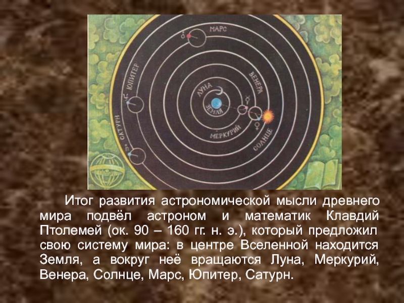 Птолемей (ок. 90 – 160 гг. н. э.), который предложил свою систему мира: в центре Вселенной находится Земля, а вокруг неё вращаются Луна, Меркурий, Венера, Солнце, Марс, Юпитер, Сатурн.