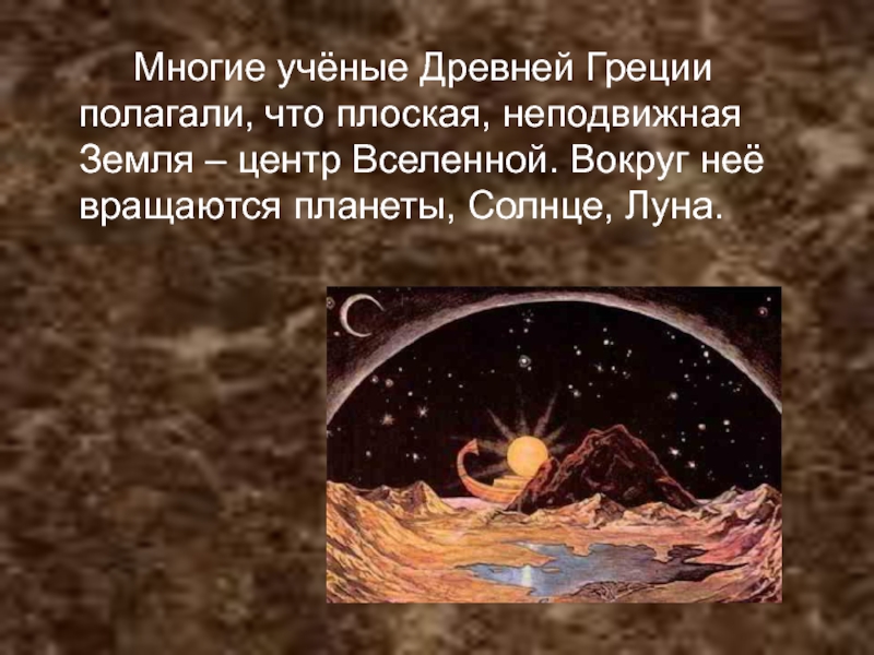 Слайд 10 Многие учёные Древней Греции полагали, что плоская, неподвижная Земля – центр