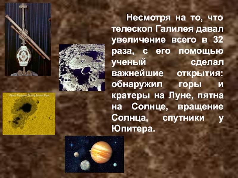 раза, с его помощью ученый сделал важнейшие открытия: обнаружил горы и кратеры на Луне, пятна на Солнце, вращение Солнца, спутники у Юпитера.