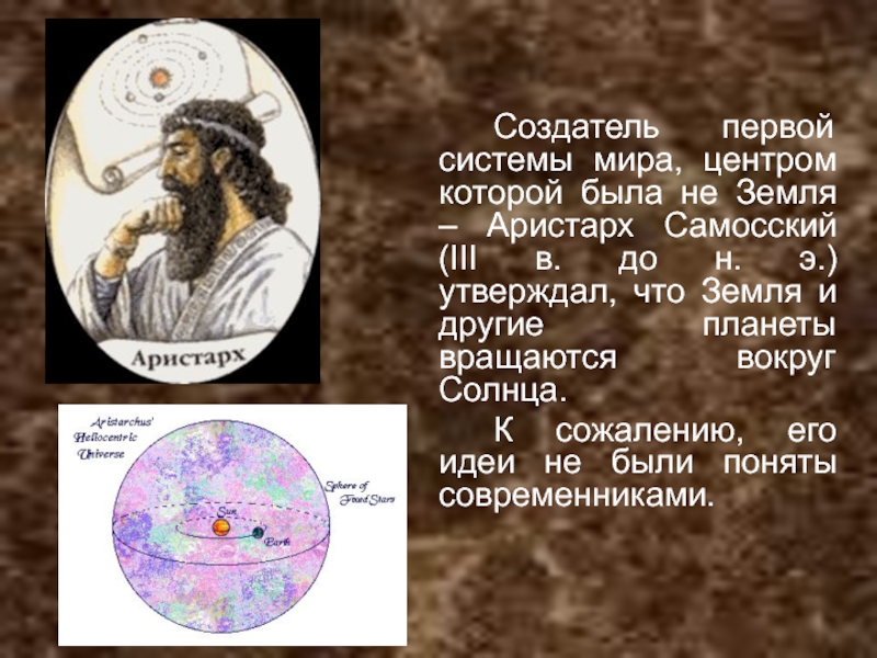 Слайд 14 Создатель первой системы мира, центром которой была не Земля – Аристарх