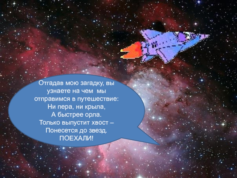 Отгадав мою загадку, вы узнаете на чем мы отправимся в путешествие:Ни пера, ни крыла,А быстрее орла.Только выпустит хвост –Понесется до звезд.ПОЕХАЛИ!