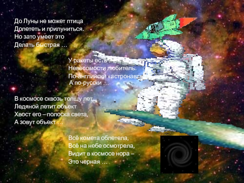 До Луны не может птица Долететь и прилуниться.Но зато умеет этоДелать быстрая …