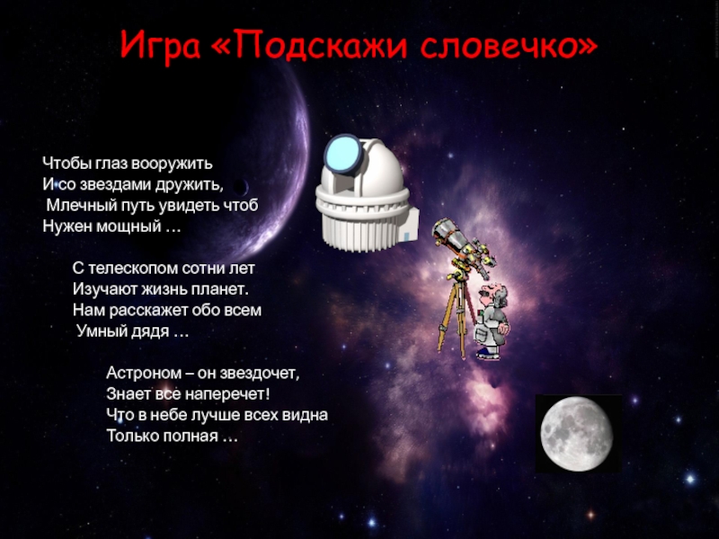 Игра «Подскажи словечко»Чтобы глаз вооружитьИ со звездами дружить, Млечный путь увидеть чтобНужен мощный …