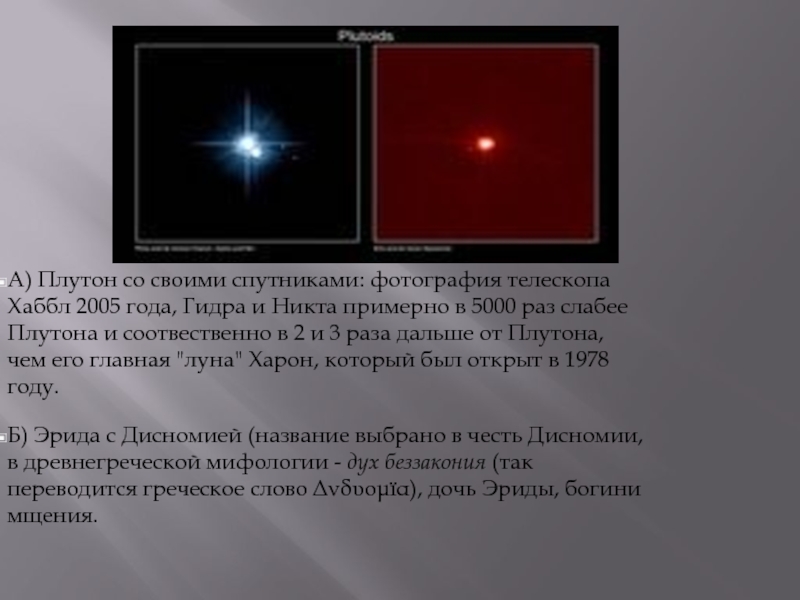 А) Плутон со своими спутниками: фотография телескопа Хаббл 2005 года, Гидра и Никта примерно в 5000 раз слабее Плутона и соотвественно в 2 и 3 раза дальше от Плутона, чем его главная "луна" Харон, который был открыт в 1978 году.