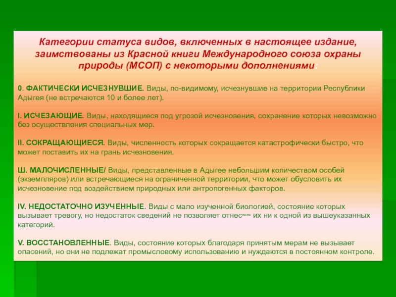 Слайд 14Категории статуса видов, включенных в настоящее издание, заимствованы из Красной книги