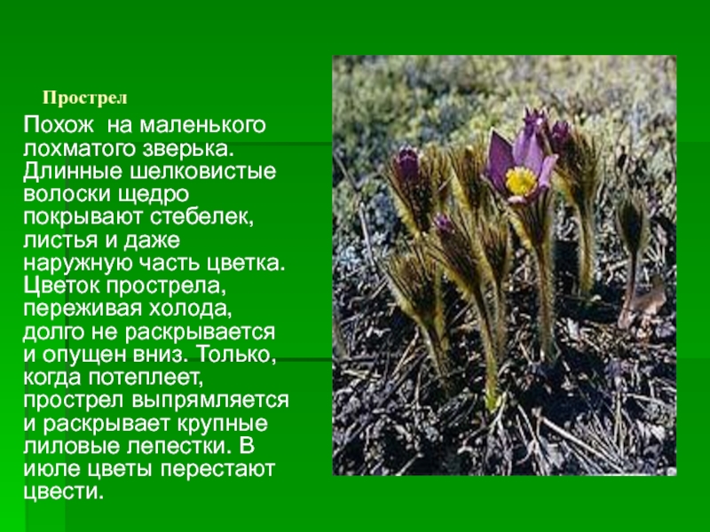 листья и даже наружную часть цветка. Цветок прострела, переживая холода, долго не раскрывается и опущен вниз. Только, когда потеплеет, прострел выпрямляется и раскрывает крупные лиловые лепестки. В июле цветы перестают цвести.