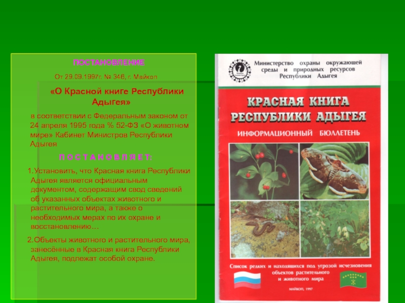 Установить, что Красная книга Республики Адыгея является официальным документом, содержащим свод сведений об указанных объектах животного и растительного мира, а также о необходимых мерах по их охране и восстановлению…
