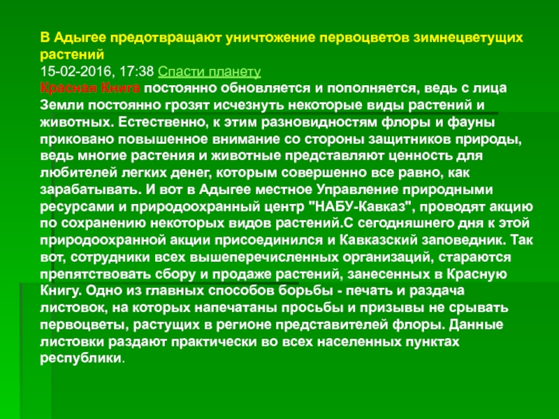 постоянно обновляется и пополняется, ведь с лица Земли постоянно грозят исчезнуть некоторые виды растений и животных. Естественно, к этим разновидностям флоры и фауны приковано повышенное внимание со стороны защитников природы, ведь многие растения и животные представляют ценность для любителей легких денег, которым совершенно все равно, как зарабатывать. И вот в Адыгее местное Управление природными ресурсами и природоохранный центр "НАБУ-Кавказ", проводят акцию по сохранению некоторых видов растений.С сегодняшнего дня к этой природоохранной акции присоединился и Кавказский заповедник. Так вот, сотрудники всех вышеперечисленных организаций, стараются препятствовать сбору и продаже растений, занесенных в Красную Книгу. Одно из главных способов борьбы - печать и раздача листовок, на которых напечатаны просьбы и призывы не срывать первоцветы, растущих в регионе представителей флоры. Данные листовки раздают практически во всех населенных пунктах республики.