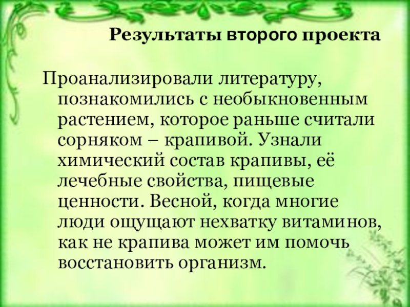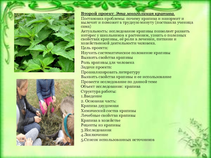 крапивой. Узнали химический состав крапивы, её лечебные свойства, пищевые ценности. Весной, когда многие люди ощущают нехватку витаминов, как не крапива может им помочь восстановить организм.