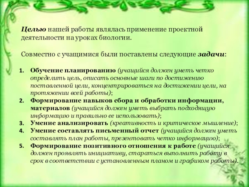Слайд 6Целью нашей работы являлась применение проектной деятельности на уроках биологии.