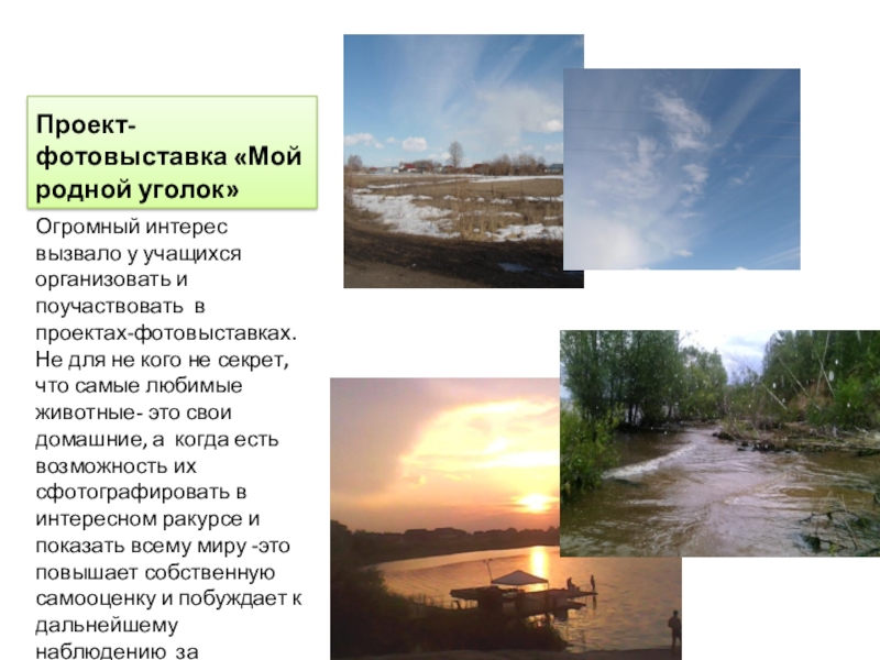 в проектах-фотовыставках. Не для не кого не секрет, что самые любимые животные- это свои домашние, а когда есть возможность их сфотографировать в интересном ракурсе и показать всему миру -это повышает собственную самооценку и побуждает к дальнейшему наблюдению за окружающей природой.