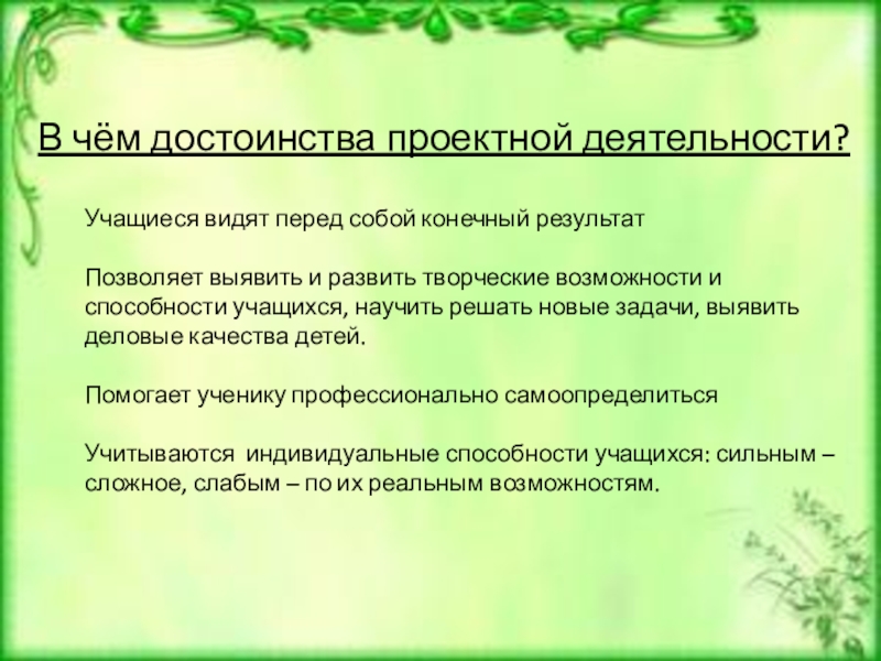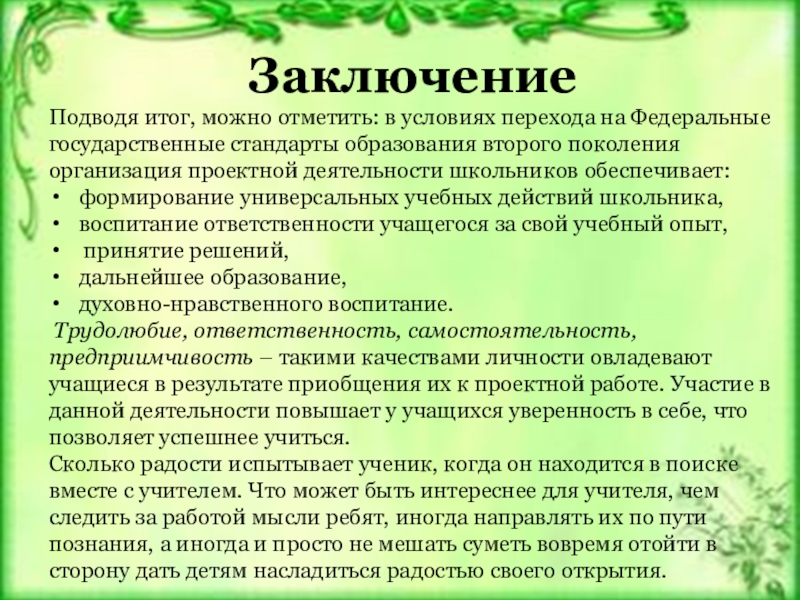 Трудолюбие, ответственность, самостоятельность, предприимчивость – такими качествами личности овладевают учащиеся в результате приобщения их к проектной работе. Участие в данной деятельности повышает у учащихся уверенность в себе, что позволяет успешнее учиться.