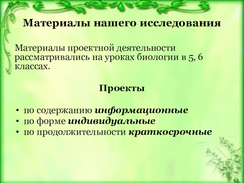 Материалы проектной деятельности рассматривались на уроках биологии в 5,