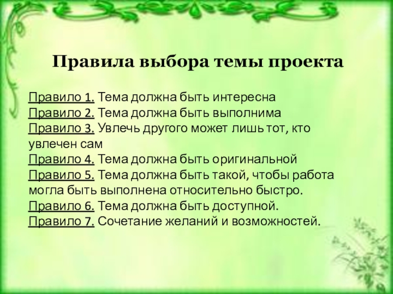 Правило 5. Тема должна быть такой, чтобы работа могла быть выполнена относительно быстро.