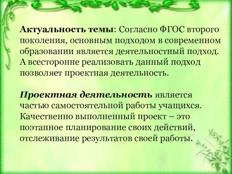Слайд 3Актуальность темы: Согласно ФГОС второго поколения, основным подходом в современном образовании