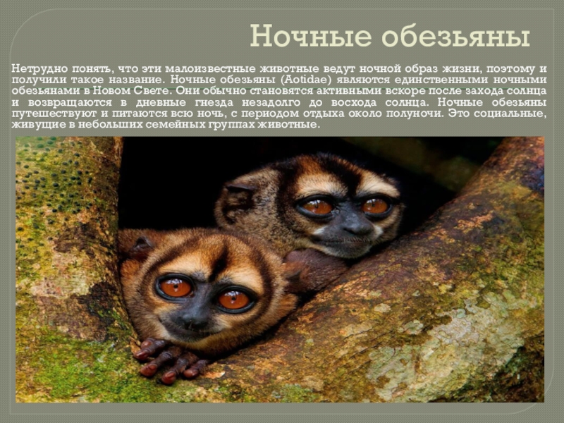 поэтому и получили такое название. Ночные обезьяны (Aotidae) являются единственными ночными обезьянами в Новом Свете. Они обычно становятся активными вскоре после захода солнца и возвращаются в дневные гнезда незадолго до восхода солнца. Ночные обезьяны путешествуют и питаются всю ночь, с периодом отдыха около полуночи. Это социальные, живущие в небольших семейных группах животные.