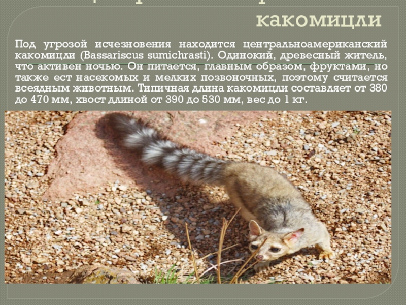 Под угрозой исчезновения находится центральноамериканский какомицли (Bassariscus sumichrasti). Одинокий, древесный