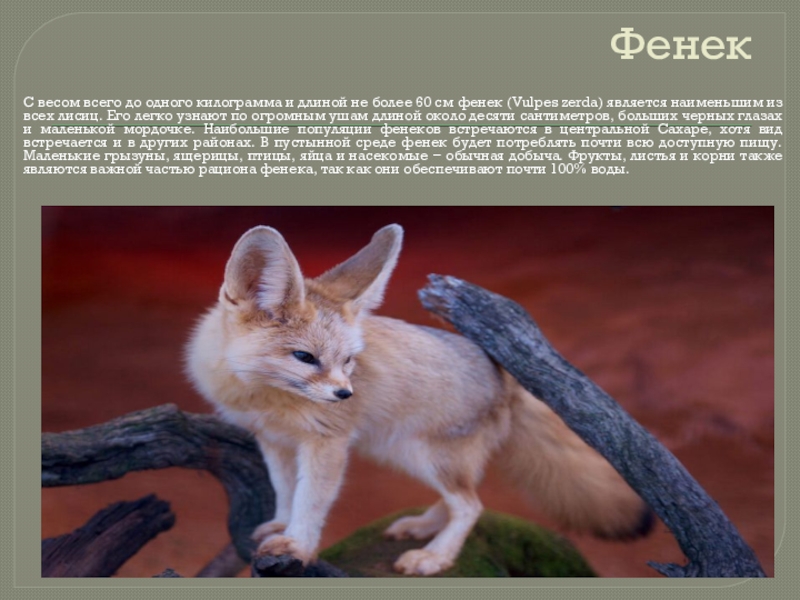 см фенек (Vulpes zerda) является наименьшим из всех лисиц. Его легко узнают по огромным ушам длиной около десяти сантиметров, больших черных глазах и маленькой мордочке. Наибольшие популяции фенеков встречаются в центральной Сахаре, хотя вид встречается и в других районах. В пустынной среде фенек будет потреблять почти всю доступную пищу. Маленькие грызуны, ящерицы, птицы, яйца и насекомые − обычная добыча. Фрукты, листья и корни также являются важной частью рациона фенека, так как они обеспечивают почти 100% воды.