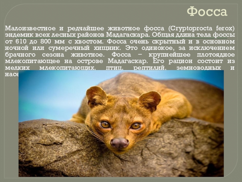 Мадагаскара. Общая длина тела фоссы от 610 до 800 мм с хвостом. Фосса очень скрытный и в основном ночной или сумеречный хищник. Это одинокое, за исключением брачного сезона животное. Фосса − крупнейшее плотоядное млекопитающее на острове Мадагаскар. Его рацион состоит из мелких млекопитающих, птиц, рептилий, земноводных и насекомых. Также фосса охотится на лемуров.