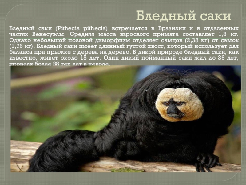 частях Венесуэлы. Средняя масса взрослого примата составляет 1,8 кг. Однако небольшой половой диморфизм отделяет самцов (2,38 кг) от самок (1,76 кг). Бледный саки имеет длинный густой хвост, который использует для баланса при прыжке с дерева на дерево. В дикой природе бледный саки, как известно, живет около 15 лет. Один дикий пойманный саки жил до 36 лет, проведя более 28 тех лет в неволе.
