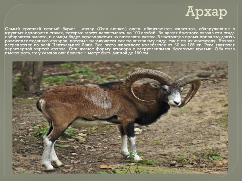 обнаруженное в крупных однополых стадах, которые могут насчитывать до 100 особей. Во время брачного сезона эти стада собираются вместе, и самцы будут соревноваться за внимание самок. В настоящее время признано девять различных подвидов архаров, которые различаются как по внешнему виду, так и по их диапазону. Архары встречаются по всей Центральной Азии. Вес этого животного колеблется от 60 до 185 кг. Рога являются характерной чертой архара. Они имеют форму штопора с закругленными боковыми краями. Оба пола имеют рога, но у самцов они больше − могут быть длиной до 190 см.