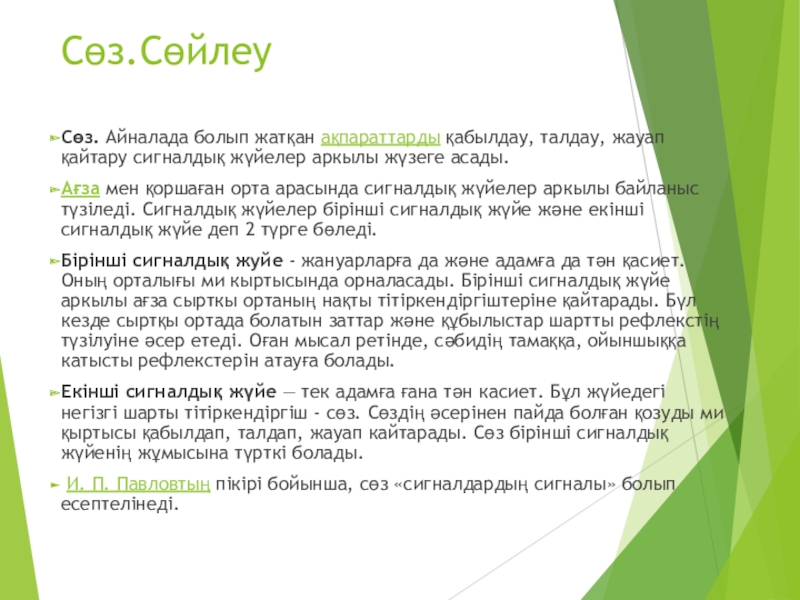 Сөз. Айналада болып жатқан ақпараттарды қабылдау, талдау, жауап қайтару сигналдық жүйелер аркылы жүзеге асады.