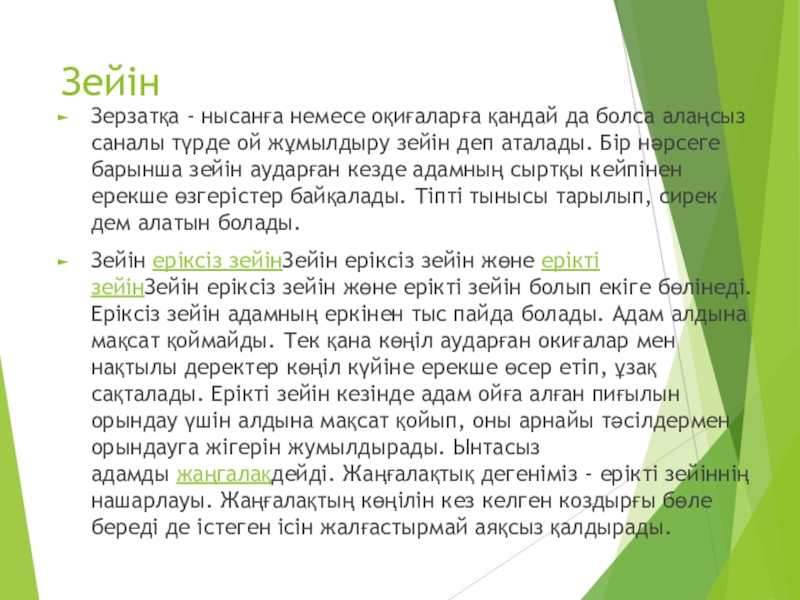 Зейін еріксіз зейінЗейін еріксіз зейін жөне ерікті зейінЗейін еріксіз зейін жөне ерікті зейін болып екіге бөлінеді. Еріксіз зейін адамның еркінен тыс пайда болады. Адам алдына мақсат қоймайды. Тек қана көңіл аударған окиғалар мен нақтылы деректер көңіл күйіне ерекше өсер етіп, ұзақ сақталады. Ерікті зейін кезінде адам ойға алған пиғылын орындау үшін алдына мақсат қойып, оны арнайы тәсілдермен орындауга жігерін жумылдырады. Ынтасыз адамды жаңгалақдейді. Жаңғалақтық дегеніміз - ерікті зейіннің нашарлауы. Жаңғалақтың көңілін кез келген коздырғы бөле береді де істеген ісін жалғастырмай аяқсыз қалдырады.