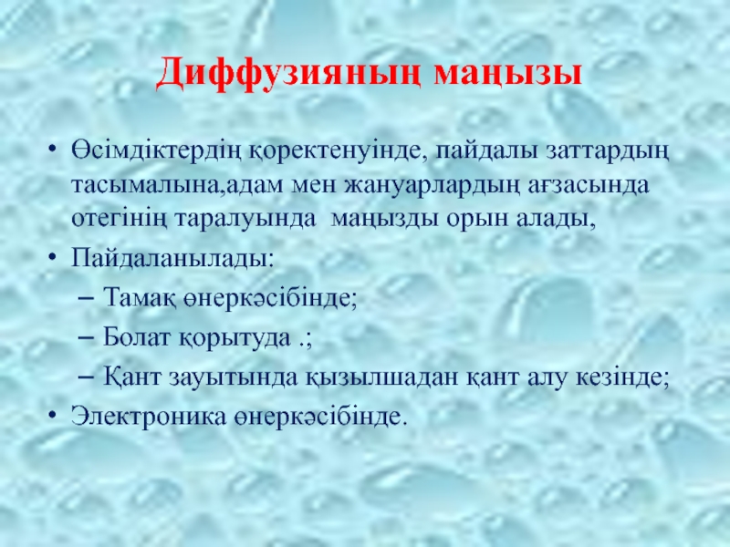 Диффузияның маңызы  Өсімдіктердің қоректенуінде, пайдалы заттардың тасымалына,адам мен жануарлардың ағзасында отегінің таралуында маңызды орын алады,Пайдаланылады:Тамақ өнеркәсібінде;