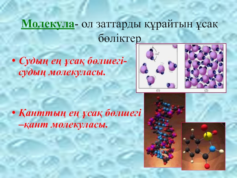 Молекула- ол заттарды құрайтын ұсақ бөліктерСудың ең ұсақ бөлшегі-судың молекуласы. Қанттың ең ұсақ бөлшегі –қант молекуласы.